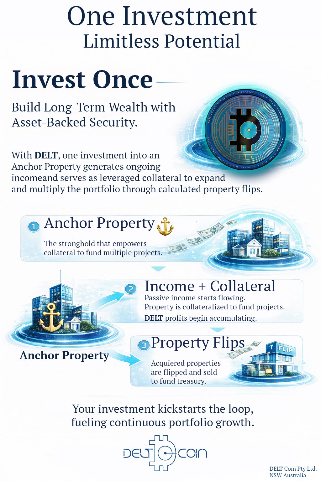 The DELT Coin anchor property will serve as the foundational asset that seeds a scalable, repeatable investment engine: